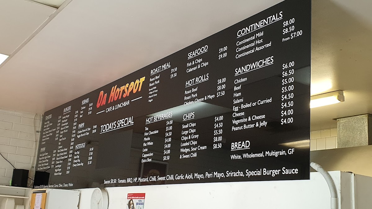 The menu at Da Hotspot Cafe & Lunchbar offers a variety of meal options suitable for breakfast, lunch, and casual dining. It features a selection of kebabs with chicken, pork, and beef options, catering to those seeking quick, filling meals.